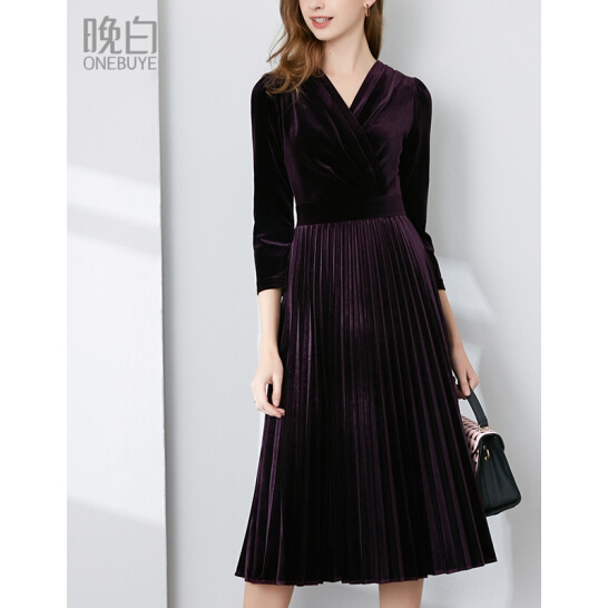 晚白 2020春新品通勤纯色V领收腰显瘦中长款百褶A字丝绒连衣裙女 紫色 L