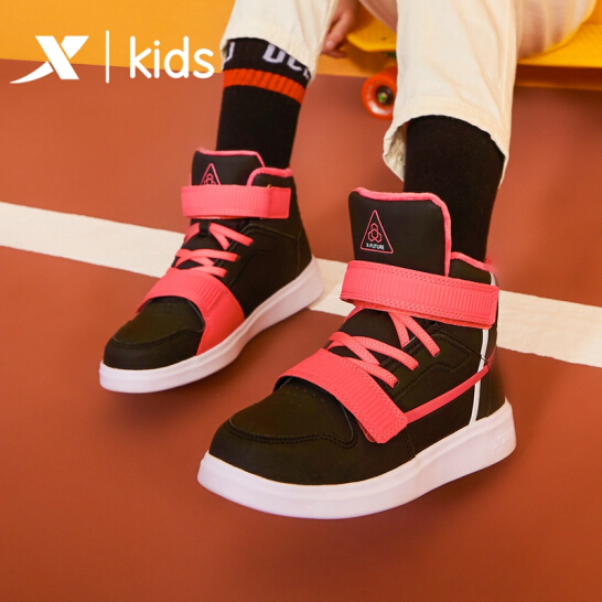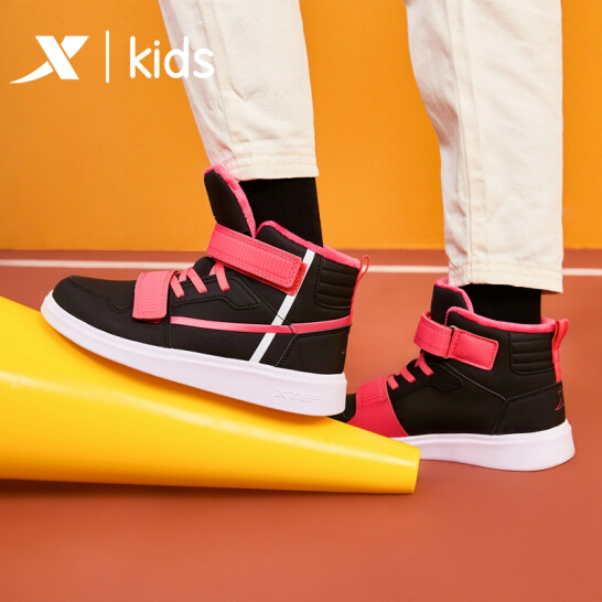 特步童鞋 2019年春季新款儿童棉鞋高帮女中大童板鞋时尚运动鞋 681414379138 黑玫红 34