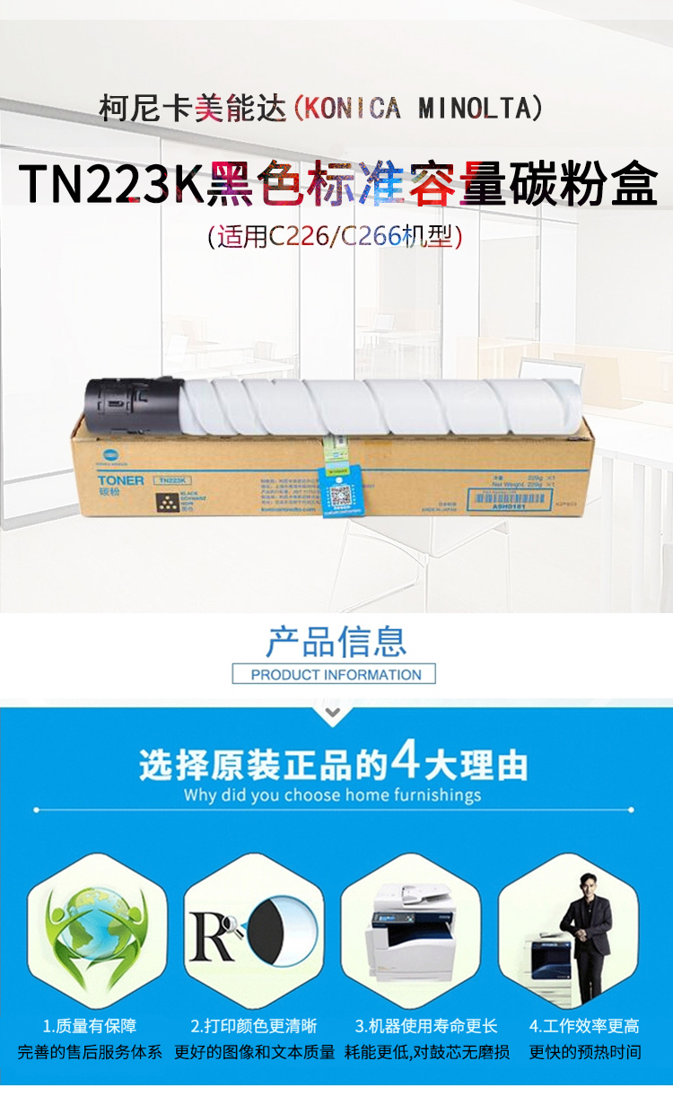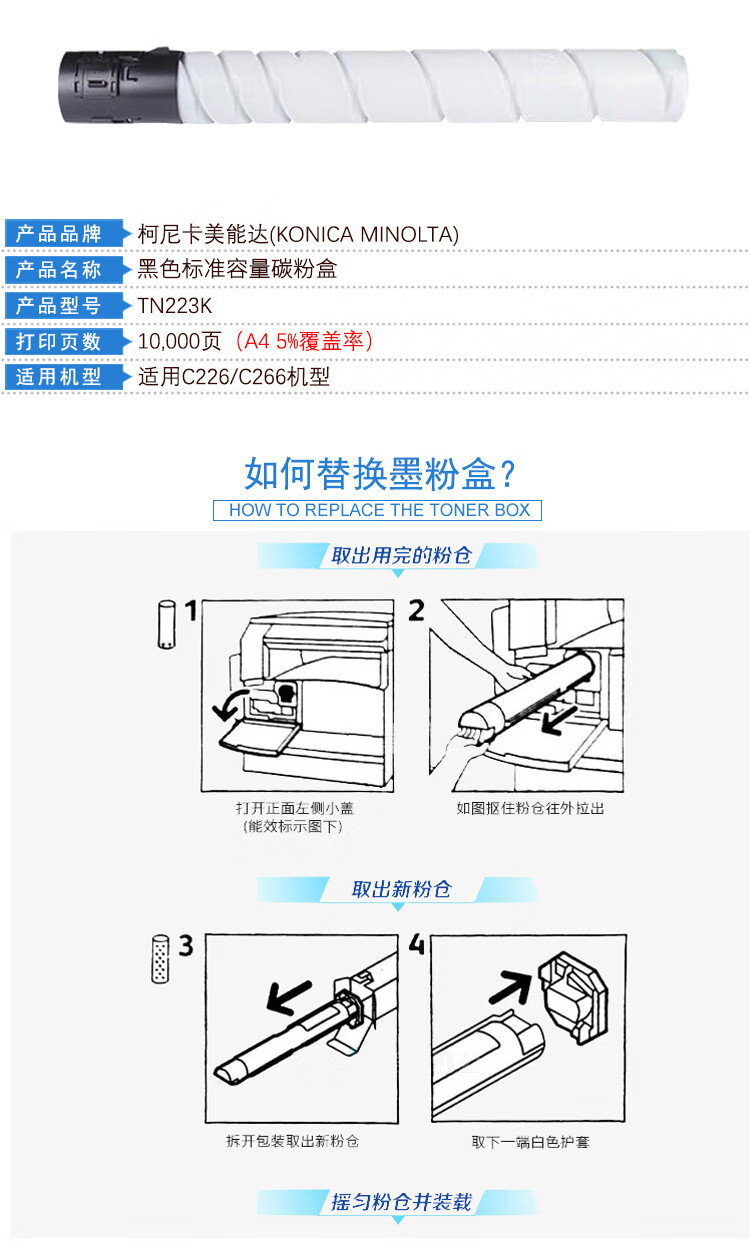 商品名称:柯尼卡美能达 KONICA MINOLTA TN223K 柯美碳粉盒黑色标容墨粉1支(适用C226/C266) 印量10000页